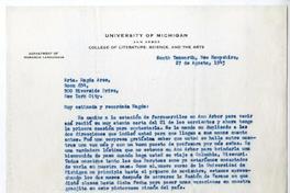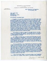 El remitente acusa recibo de carta del 21 de agosto. Dice estar ansioso por ver el libro de Magda Arce sobre Bibliotecas, él cual le ha dedicado. Se alegra también que éste en el Stephens College.