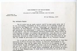 El remitente acusa recibo de carta del 8 de febrero. Dice que su reseña sobre "La generación chilena de 1842" se publicará en el próximo número de la "Hispanic Review", entre otros asuntos personales.