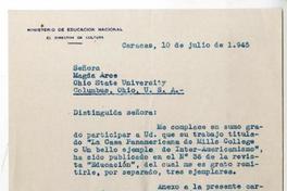 Caracas, Venezuela [a] Magda Arce, Ohio State University, Columbus, Ohio Carta, 1945 julio 10, [manuscrito] Juan Bautista Plaza.