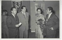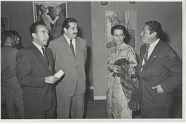 Nicomedes Guzmán en una exposición de arte [Fotografía]. [Santiago, Chile] ; [Producción no identificada], cerca de 1955. 1 fotografía : Monocromo blanco y negro, papel brillante ; 11,3 x 17,3 cm. .