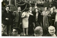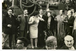 Edmundo Herrera junto a otros escritores durante una celebración, junto al Locomóvil en los jardínes de la casa de Pablo Neruda en Isla Negra.