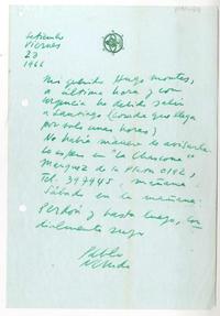 Isla Negra, Chile [a] Hugo Montes Carta, 1969 septiembre 23, [manuscrito] Pablo Neruda.