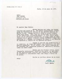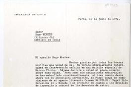 Paris, Francia [a] Hugo Montes, Santiago, Chile Carta, 1972 junio 19, [manuscrito] Pablo Neruda.