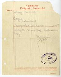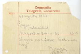 Santiago, Chile [a] Laura Reyes, Temuco, Chile Telegrama, 1933 agosto 28, [manuscrito] Pablo Neruda.