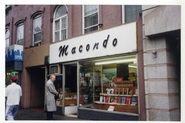 Pedro Lastra en las puertas de la Libreria Macondo en Manhattan.