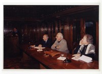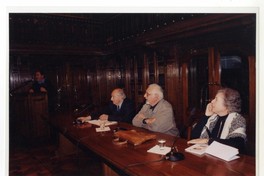 Pedro Lastra durante la presentacion de un libro con Jaime Valdivieso y Juan Camilo Lorca, en la Sala Ercilla de la Biblioteca Nacional de Chile.