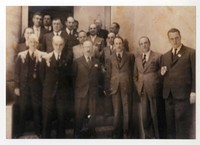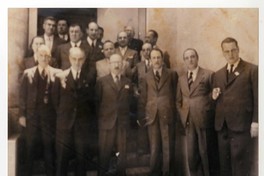 Mariano Latorre junto a otros escritores [fotografía]. Santiago, Chile ; [Producción no identificada], Cerca de 1940. 1 fotografía : Sepia, 9 x 12 cm. .