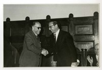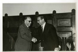 Hugo Montes Brunet recibe felicitaciones de Rodolfo Oroz como nuevo miembro de la Academia Chilena de la Lengua. Sentado se observa a Jaime Eyzaguirre.