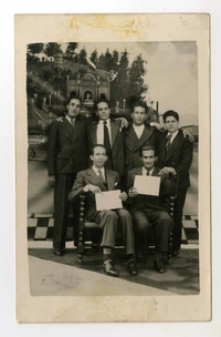 Luis Oyarzún junto a sus compañeros del Internado Nacional Barros Arana: Segunda fila, Nicanor Parra, Abajo al lado derecho Jorge Millas.