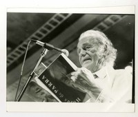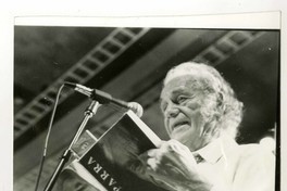 Nicanor Parra [fotografía]. [Santiago, Chile] ; [Producción no identificada], 1997. 1 fotografía : Monocromo blanco y negro, 11 x 13,5 cm. .