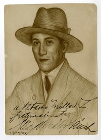 Fotografía de un retrato a carbón de Oreste Plath (Octavio Miller), Firmado por A. Palmerola y con una dedicatoria de Elías González Jauch.