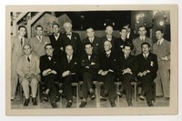 Comida en honor a Laureano Rodríguez en el restaurant "El Castillo". De izquierda a derecha: Oreste Plath, Alfredo Mujica, Augusto d'Halmar, Victoriano Lillo, Calvo Nieto, Enrique Ponce, Pascual Brandi, Luis Hurtado, Laureano Rodríguez, Luis Thayer, Carlos Casassus, Mario Vergara Gallardo.