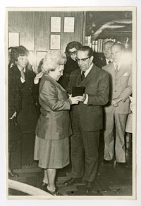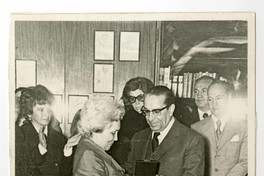 Isolda Pradel recibe la medalla "Andres Bello" de parte del Embajador de Venezuela, en reconocimiento al Fondo Literario de la Biblioteca Nacional, por los originales de la Obra de Oscar Castro.
