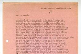 Berlin, Alemania [a] Hernán Valdés, Barcelona, España Carta, 1981 lunes de Pentecostés, [manuscrito] / Antonio Avaria. 1 hoja ; 29,5 x 21 cm. .