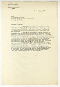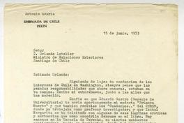 Pekin, China [a] Orlando Letelier, Ministro de Relaciones Exteriores, Chile Carta, 1973 junio 15, [manuscrito] Antonio Avaria.