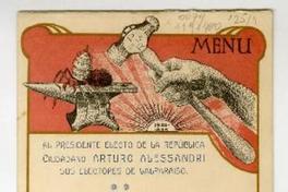 Menú para un almuerzo realizado al Presidente electo Arturo Alessandrí por sus electores de Valparaíso.