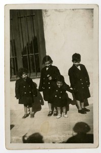 Fernando Quilodrán al año de edad junto a sus hermanos. Al reverso de la fotografía esta escrito a tinta : "Aquí están con los abrigos que les trajo la tía Marina, son azul marino".