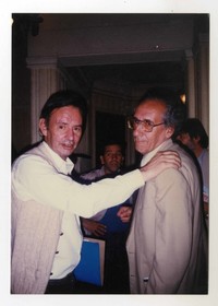 Fernando Quilodrán y Jorge Teillier [fotografía]. [Santiago, Chile] ; [Producción no identificada], cerca de 1994. 1 fotografía : color, 8,9 x 12,6 cm. .