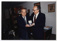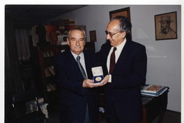 Fernando Quilodrán en el Centro Cultural de Michoacán, mostrando la medalla que le otorgó la Reina Beatrix de Los Paises Bajos.