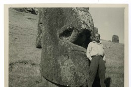 Salvador Reyes en Isla de Pascua posando junto a un Moai.