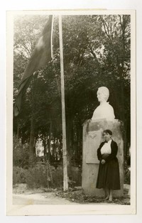 Laura Rodig en Vicuña al lado de la escultura de Gabriela Mistral.