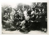 Alumnas de la Escuela Normal de Santiago : Haydee Cerrillo, Lidia Teutsch Solar, Hilda Gallardo, Juana Ramón y María Baeza (sentada en el suelo, esposa de Manuel Rojas).