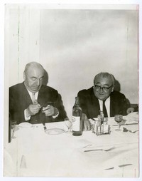 Andrés Sabella y Pablo Neruda [Fotografía]. [Santiago, Chile] ; [Producción no identificada], Cerca de 1971. 1 fotografía : Monocromo blanco y negro, papel brillante ; 14 x 18 cm. .