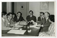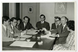 Reunión en el Centro de Investigacion de Literatura comparada en la Universidad de Chile, asisten : Jorge Muñoz, Carlos Morand, Nelly Donoso, Antonio Bombal, Armando Uribe Arce, Olaf Christiansen, Ramón García Castro, Paulius Stelingis y Marta Glukman.