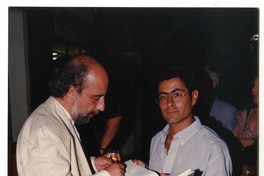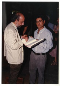 Raúl Zurita firmando uno de sus libros en una actividad en la "Estacion Mapocho".