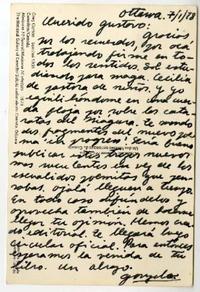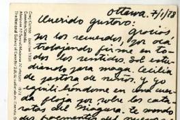 Ottawa, Canadá [a] Gustavo Mujica Tarjeta, 1978 enero 7, [manuscrito] / Gonzalo Millán. 1 tarjeta : 16 x 10 cm. .