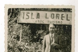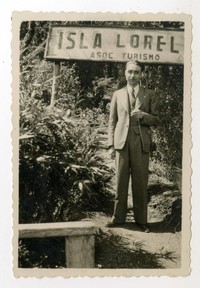 Oscar Castro en Isla Loreley [fotografía]. Puerto Varas, Chile : [Producción no identificada], 1943. 1 fotografía : Monocromo blanco y negro, 5,5 x 8,5 cm. .