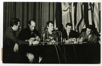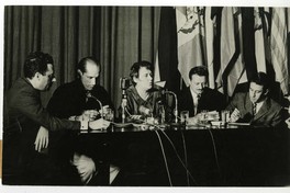 Haydee Santamaría respondiendo a las preguntas formuladas sobre la guerra de Vietnam por el panel de escritores latinoamericanos. De izquierda a derecha : Enrique lihn (Chile), Roberto Fernández Retamar (Cuba), Haydee Santamaría (Cuba), Mario Benedetti (Uruguay) y Roque Dalton (El Salvador).
