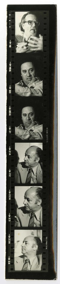 1 hoja de contactos de 1 tira de negativo, con una selección de 6 cuadros con imágenes de José Donoso, Enrique Lihn y Jorge Edwards.