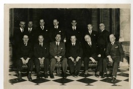 Mariano Latorre sentado : primero de izquierda a derecha, junto a otros asistentes, en la Biblioteca Nacional de Chile.