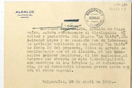 El Alcalde de Valparaíso comunica a Salvador Reyes, como periodosta del diario "La Unión", que la I. Municipalidad no desarrolla ninguna guerra sorda contra el reino vegetal y que nadie es enemigo de los árboles.