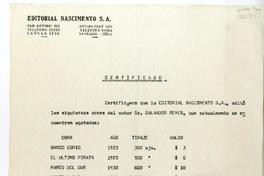 La Editorial Nascimento certifica que editó cuatro obras de Salvador Reyes : "Barco ebrio" en 1923, "El último pirata" en 1925, "Mares del Sur" en 1930 y "Norte y Sur"en 1947.