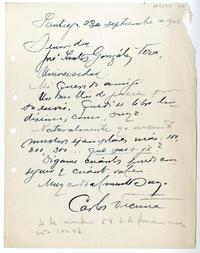 Santiago, Chile [a] José Santos González Vera Cartas, 1946, [manuscrito] / Carlos Vicuña. 2 cartas (3 hojas) ; 27,5 x 21,5 cm. .