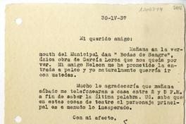 Espera su asistencia al Teatro Municipal por "Bodas de sangre" de García Lorca. Solicita información sobre las causas que obligan a la mujer a trabajar. Lo invita a ver la "Morena Clara" y "Gracia y Justicia" al Municipal.