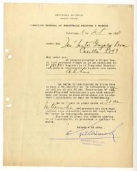 Santiago, Chile [a] José Santos González Vera Registros de derechos de autor, 4 de septiembre de 1930 y 30 de marzo de 1951, [manuscrito] / Dirección General de Bibliotecas, Archivos y Museos. 2 hojas ; 33 x 21 cm. .