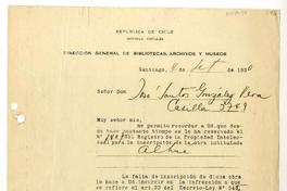 Santiago, Chile [a] José Santos González Vera Registros de derechos de autor, 4 de septiembre de 1930 y 30 de marzo de 1951, [manuscrito] Dirección General de Bibliotecas, Archivos y Museos.