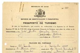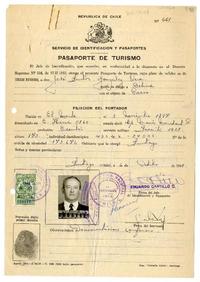 Santiago, Chile [a] José Santos González Vera Pasaporte de turismo, 6 de octubre de 1948, [manuscrito] / Servicio de Identificación y Pasaportes (Chile). 1 hoja ; 33 x 21 cm. .