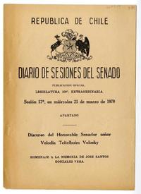 Discurso pronunciado en memoria de José Santos González Vera, publicado en el apartado del Diario de Sesiones del Senado. Sesión 57, en miércoles 25 de marzo de 1970.