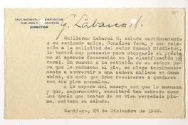 3 cartas : Santiago, Chile, 26 de mayo de 1942 / Claude G. Bowers (1 hoja) -- Santiago, Chile, viernes 21 / Tomás Gatica Martínez (1 tarjeta) -- Santiago, Chile, 22 de diciembre de 1942 / Guillermo Labarca H. (1 tarjeta).