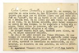 14 cartas : "Adhesión a Montenegro" (sin fecha) / Fausto Soto (1 hoja) -- Washington, Estados Unidos, 28 de marzo, 28 de mayo, 14 de junio de 1952 /Fausto Soto (3 cartas, 4 hojas) -- Santiago, Chile, 23 de febrero de 1952 / Antonio González (1 hoja) -- Tennessee, Estados Unidos, 3 de junio de 1969 / James O. Swain (2 hojas) -- Santiago, Chile, 12 de junio y 2 de julio de 1952 / Joaquín Edwards Bello (2 cartas, 2 hoja) -- Florida, Estados Unidos, 17 de julio de 1952 / Sam Schulman (1 hoja) -- Montevideo, Uruguay, 25 de octubre de 1952 / Emir Rodríguez Monegal (2 hojas) -- Budapest, Hungría, 31 de octubre de 1952 (1 hoja) --Tennessee, Estados Unidos, 13 de diciembre de 1952 (2 hojas) -- Sucre, Bolivia, 22 de diciembre de 1952 / Pedro Llosa Beckrich (1 hoja) -- Tarjeta de Carlos Cortínez Fontecilla.