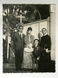 Fotografía de familia vietnamita, durante una ceremonia religiosa, dedicada a Salvador Reyes y Suzanne Bertrand.