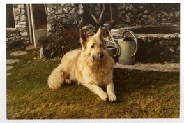Un perro en el jardín de una casa en Saint Cezáire [fotografía]. Saint Cezáire-sur-Siagne, Francia : [Producción no identificada], 1982. 1 fotografía : Color, 8,8 x 13,4 cm. .