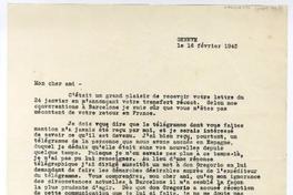 Agradece su carta y se alegra que retornara a Francia, comenta que ya está instalado en Génova y que de vez en cuando ve a sus viejos amigos de España.