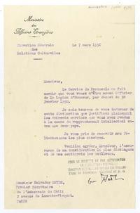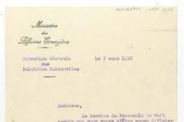 París, Francia [a] Salvador Reyes Carta, 1950 marzo 7, [manuscrito] Ministére des Affaires Etrangères.