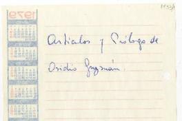 Artículos y prólogo [manuscrito] / Ovidio Guzmán Salce (Mario Bonat). 10 hojas ; 26 x 21 cm. .