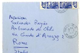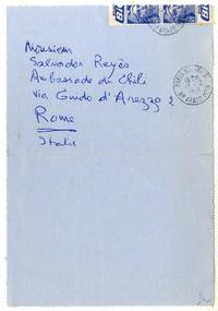 Pregunta sobre su viaje a Roma. Menciona que con su esposa Raymone irán a Suiza, posteriormente a Bélgica y Holanda. Menciona algunos artículos y envíos de libros de Salvador Reyes, también se enterá que Reyes se embarcó a la Antártida. Espera en algún momentos poder reunirse.